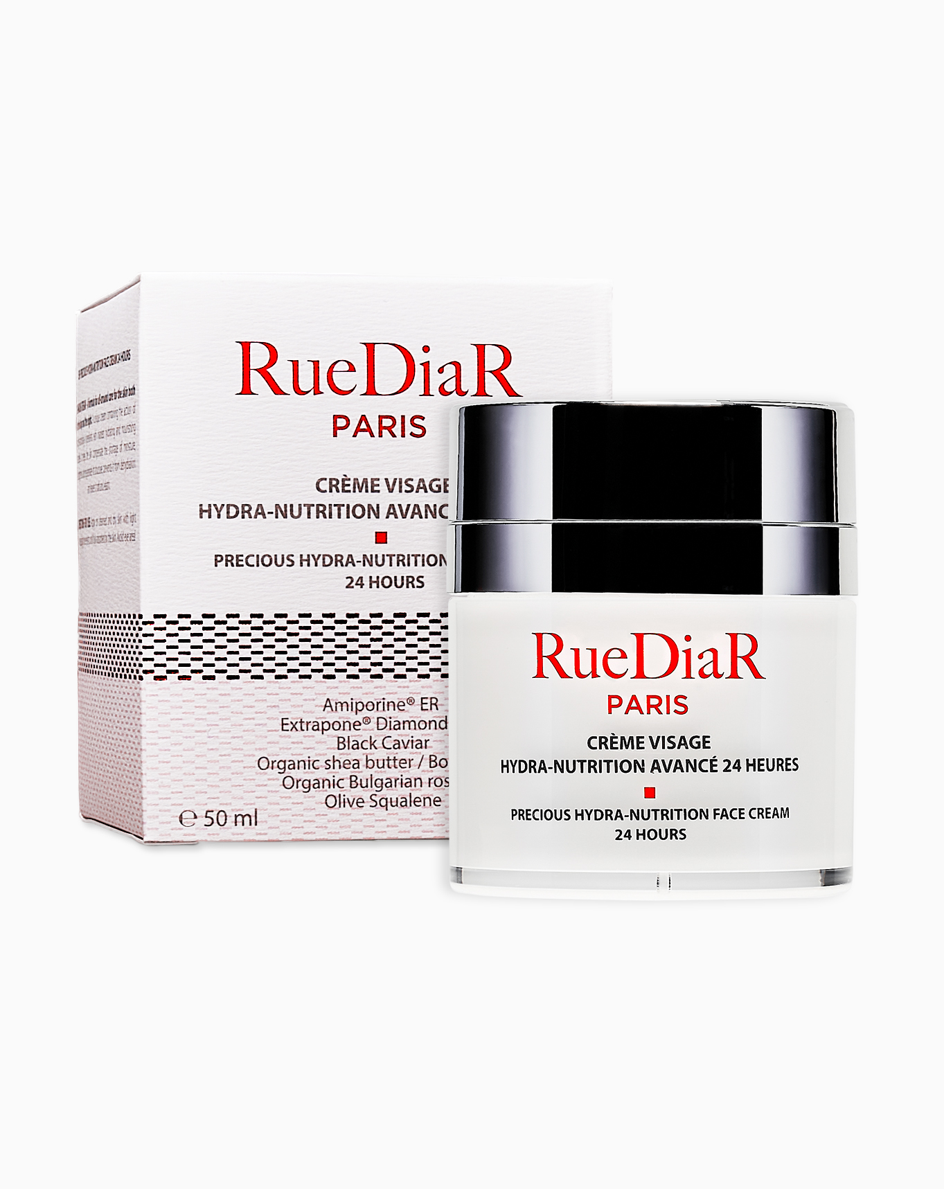 Συστατικά: εκχύλισμα ροδιού, εκχύλισμα διαμαντιών, μαύρο χαβιάρι, οργανικό βούτυρο καριτέ, οργανικό ροδέλαιο, έλαιο Squaline